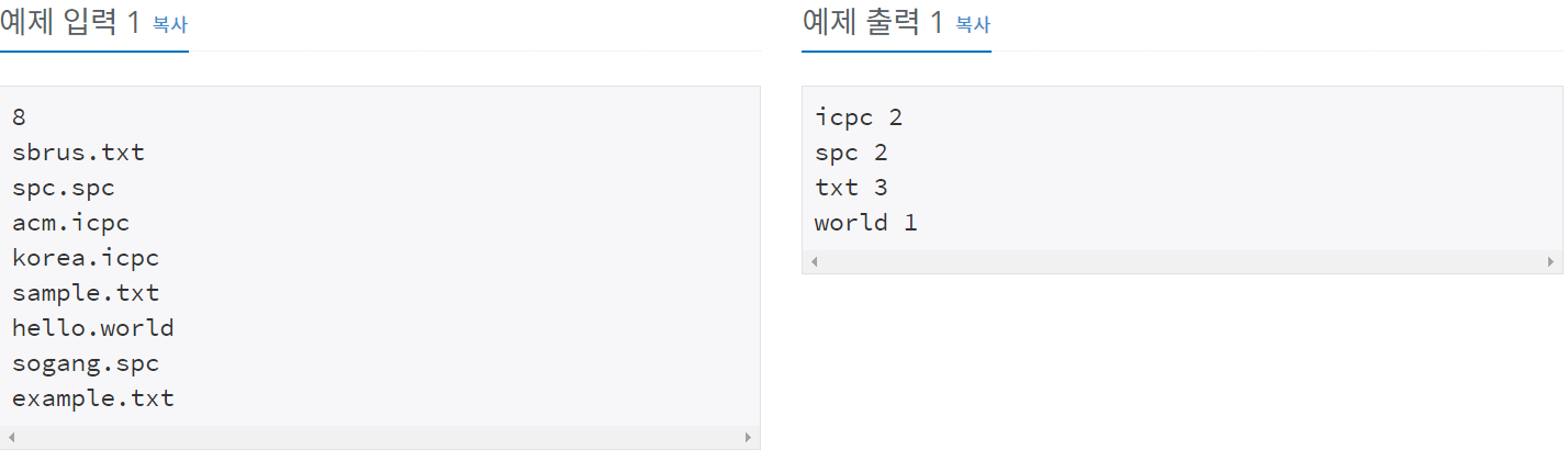 둘째 줄부터 N개 줄에 바탕화면에 있는 파일의 이름이 주어진다. 파일의 이름은 알파벳 소문자와 점(.)으로만 구성되어 있다. 점은 정확히 한 번 등장하며, 파일 이름의 첫 글자 또는 마지막 글자로 오지 않는다. 각 파일의 이름의 길이는 최소 3, 최대 100이다.