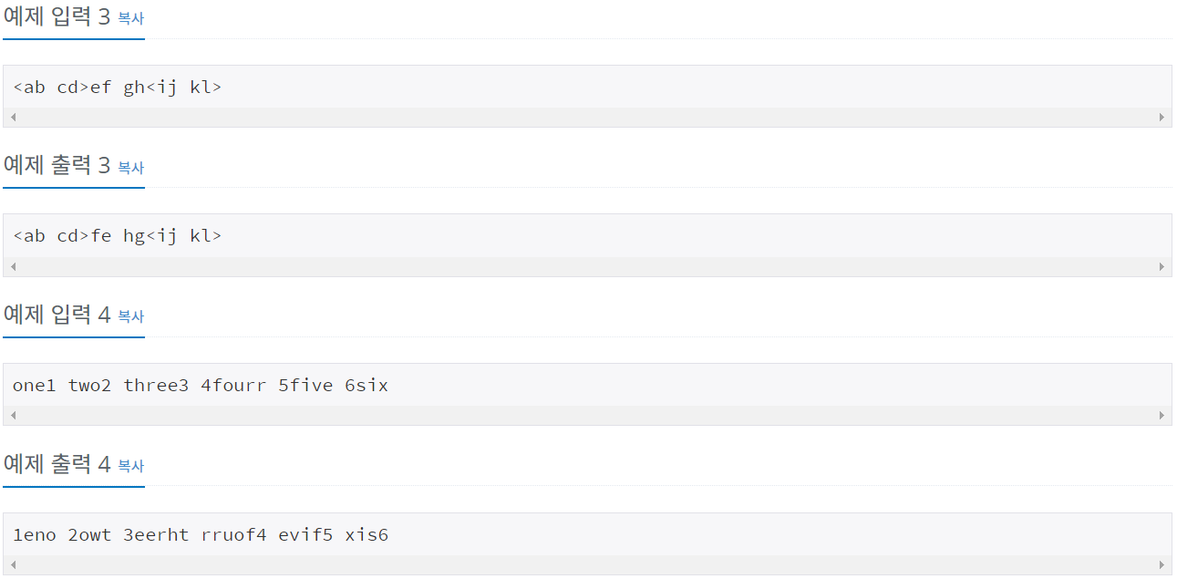 문자열 S가 주어졌을 때, 이 문자열에서 단어만 뒤집으려고 한다. 먼저, 문자열 S는 아래와과 같은 규칙을 지킨다. 알파벳 소문자('a'-'z'), 숫자('0'-'9'), 공백(' '), 특수 문자('<', '>')로만 이루어져