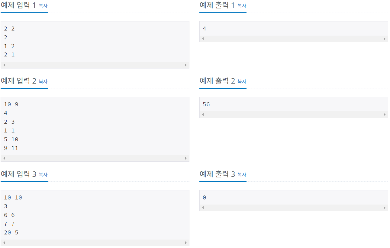 첫째 줄에 모눈종이의 크기 H, W, 둘째 줄에 스티커의 수 N이 주어진다. 다음 N개의 줄에는 스티커의 크기 Ri, Ci가 주어진다.