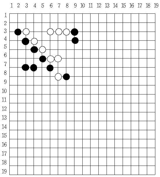 19줄에 각 줄마다 19개의 숫자로 표현되는데, 검은 바둑알은 1, 흰 바둑알은 2, 알이 놓이지 않는 자리는 0으로 표시되며, 숫자는 한 칸씩 띄어서 표시된다.