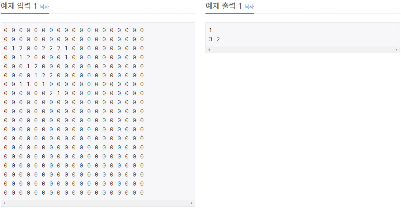 출력은 이긴 돌의 숫자와, 오목의 가장 왼쪽에 있는 돌의 좌표, 오목이 세로로 완성된 경우 가장 위에 있는 돌의 좌표를 출력하면 된다.