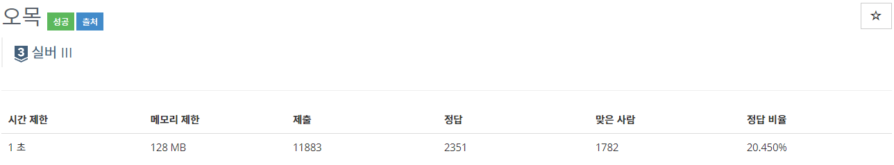 오목은 바둑판에 검은 바둑알과 흰 바둑알을 교대로 놓아서 겨루는 게임이다. 바둑판에는 19개의 가로줄과 19개의 세로줄이 그려져 있는데 가로줄은 위에서부터 아래로 1번, 2번, ... ,19번의 번호
