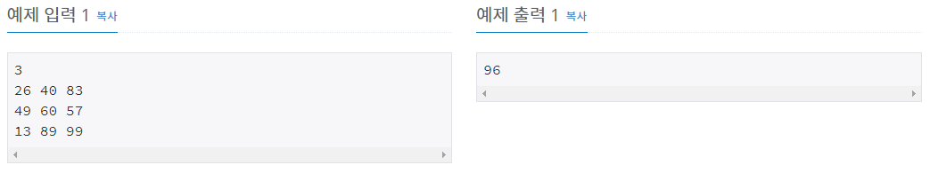첫째 줄에 집의 수 N(2 ≤ N ≤ 1,000)이 주어진다. 둘째 줄부터 N개의 줄에는 각 집을 빨강, 초록, 파랑으로 칠하는 비용이 1번 집부터 한 줄에 하나씩 주어진다. 집을 칠하는 비용은 1,000보다 작거나 같은 자연수이다.