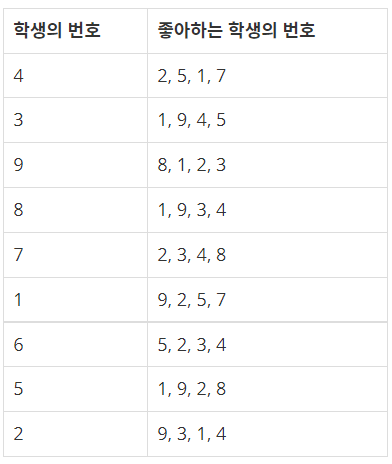 학생의 번호는 중복되지 않으며, 어떤 학생이 좋아하는 학생 4명은 모두 다른 학생으로 이루어져 있다. 입력으로 주어지는 학생의 번호, 좋아하는 학생의 번호는 N2보다 작거나 같은 자연수이다. 어떤 학생이 자기 자신을 좋아하는 경우는 없다.