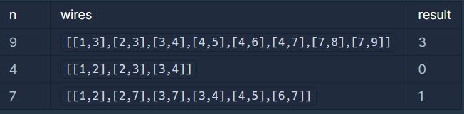 - wires의 각 원소는 [v1, v2] 2개의 자연수로 이루어져 있으며, 이는 전력망의 v1번 송전탑과 v2번 송전탑이 전선으로 연결되어 있다는 것을 의미합니다.