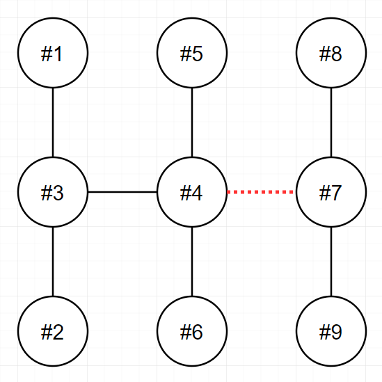 - 4번과 7번을 연결하는 전선을 끊으면 두 전력망은 각 6개와 3개의 송전탑을 가지며, 이보다 더 비슷한 개수로 전력망을 나눌 수 없습니다.
