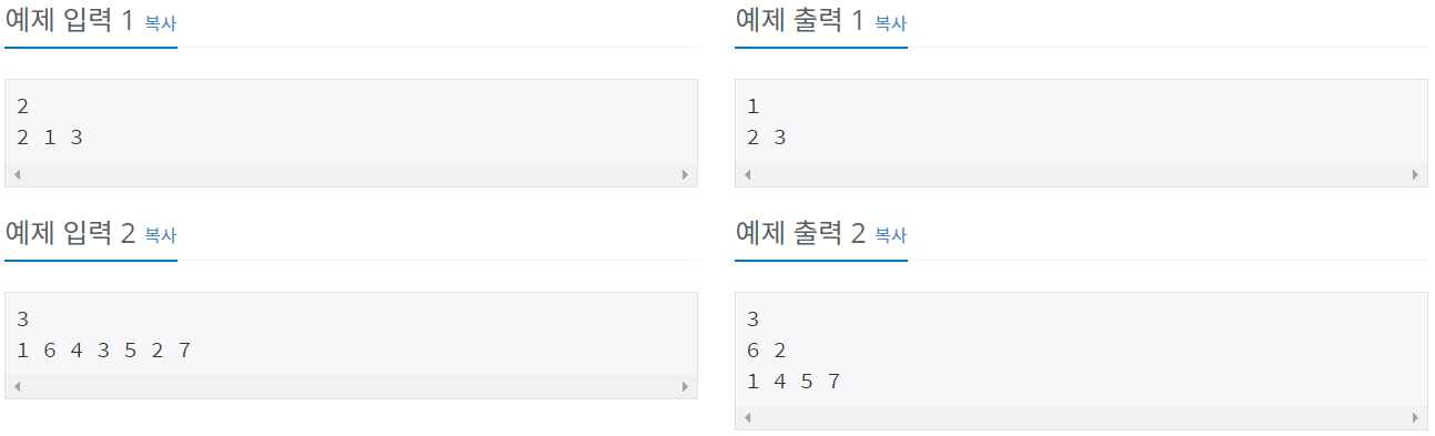 왼쪽 그림에 나와있는 마을이라면, 상근이는 2-1-3 순서대로 빌딩을 들어갔을 것이고, 오른쪽 그림의 경우에는 1-6-4-3-5-2-7 순서로 들어갔을 것이다. 상근이가 종이에 적은 순서가 모두 주어졌을 때, 각 레벨에 있는 빌딩의 번호를 구하는 프로그램을 작성하시오.