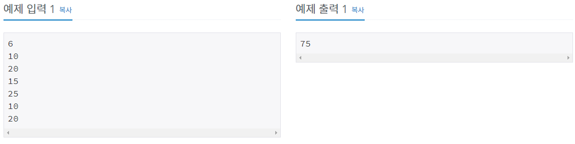 예를 들어 <그림 2>와 같이 시작점에서부터 첫 번째, 두 번째, 네 번째, 여섯 번째 계단을 밟아 도착점에 도달하면 총 점수는 10 + 20 + 25 + 20 = 75점이 된다.