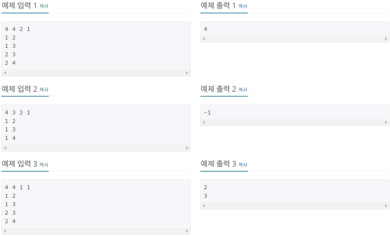 첫째 줄에 도시의 개수 N, 도로의 개수 M, 거리 정보 K, 출발 도시의 번호 X가 주어진다. (2 ≤ N ≤ 300,000, 1 ≤ M ≤ 1,000,000, 1 ≤ K ≤ 300,000, 1 ≤ X ≤ N) 둘째 줄부터 M개의 줄에 걸쳐서 두 개의 자연수 A, B가 공백을 기준으로 구분되어 주어진다. 이는 A번 도시에서 B번 도시로 이동하는 단방향 도로가 존재한다는 의미다. (1 ≤ A, B ≤ N) 단, A와 B는 서로 다른 자연수이다.