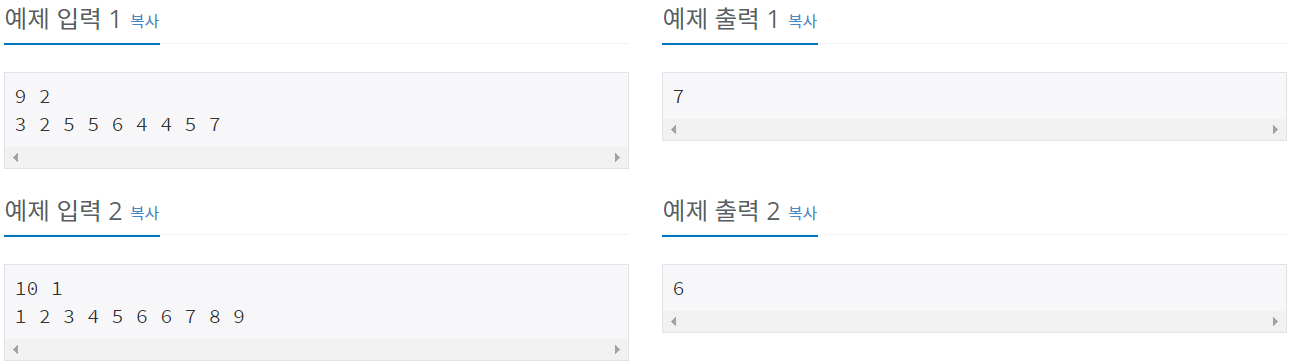 첫째 줄에 정수 N (1≤N≤200000)과 K(1≤K≤100)가 주어진다.