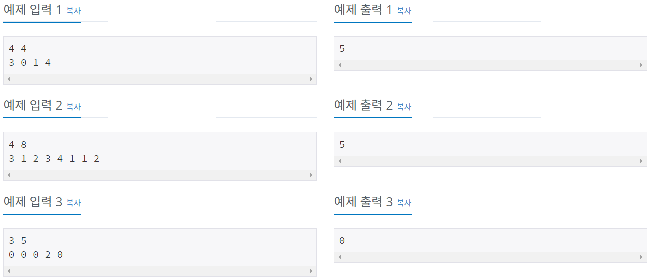 첫 번째 줄에는 2차원 세계의 세로 길이 H과 2차원 세계의 가로 길이 W가 주어진다. (1 ≤ H, W ≤ 500) 두 번째 줄에는 블록이 쌓인 높이를 의미하는 0이상 H이하의 정수가 2차원 세계의 맨 왼쪽 위치