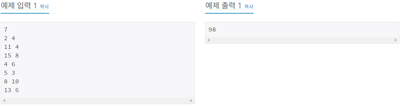첫 줄에는 기둥의 개수를 나타내는 정수 N이 주어진다. N은 1 이상 1,000 이하이다. 그 다음 N 개의 줄에는 각 줄에 각 기둥의 왼쪽 면의 위치를 나타내는 정수 L과 높이를 나타내는 정수 H가 한 개의 빈 칸을 사이에 두고 주어진다. L과 H는 둘 다 1 이상 1,000 이하이다.