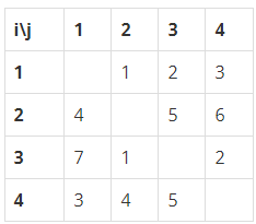 첫째 줄에 N(4 ≤ N ≤ 20)이 주어진다. 둘째 줄부터 N개의 줄에 S가 주어진다. 각 줄은 N개의 수로 이루어져 있고, i번 줄의 j번째 수는 Sij 이다. Sii는 항상 0이고, 나머지 Sij는 1보다 크거나 같고, 100보다 작거나 같은 정수이다.