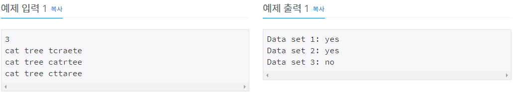 입력의 첫 번째 줄에는 1부터 1000까지의 양의 정수 하나가 주어지며 데이터 집합의 개수를 뜻한다. 각 데이터집합의 처리과정은 동일하다고 하자. 각 데이터집합에 대해, 세 개의 단어로 이루어져 있으며 공백으로 구분된다. 모든 단어는 대문자 또는 소문자로만 구성되어 있다. 세 번째 단어의 길이는 항상 첫 번째 단어와 두 번째 단어의 길이의 합이며 첫 번째 단어와 두 번째 단어의 길이는 1~200이다.