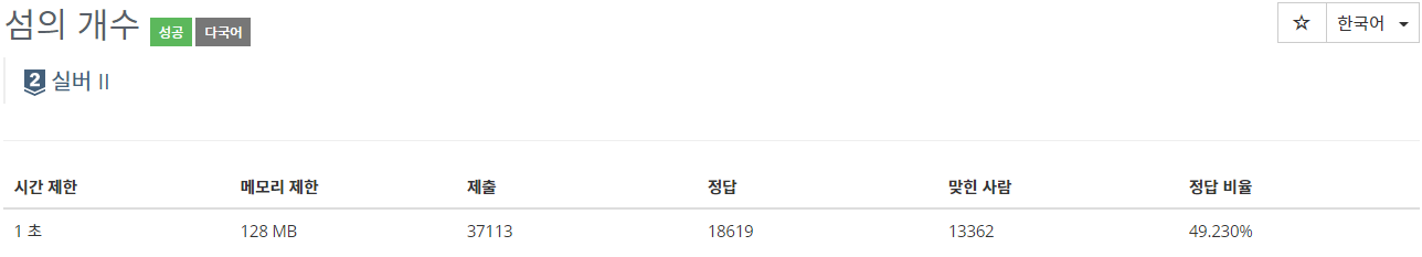 그래프의 왼쪽 위부터, 그래프의 오른쪽 아래까지 모든 칸을 bfs/dfs로 탐색하며 걸어서 갈 수 있는 칸들을 체크하여 섬의 개수를 카운트한다. 체크된 칸은 건너뛴다.