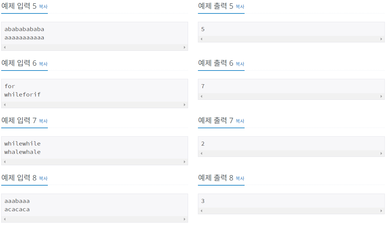 첫째 줄과 둘째 줄에 두 문자열이 주어진다. 문자열은 알파벳 소문자로만 이루어져 있으며, 최대 1000글자로 이루어져 있다.