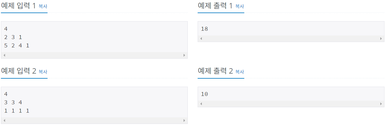 표준 입력으로 다음 정보가 주어진다. 첫 번째 줄에는 도시의 개수를 나타내는 정수 N(2 ≤ N ≤ 100,000)이 주어진다. 다음 줄에는 인접한 두 도시를 연결하는 도로의 길이가 제일 왼쪽 도로부터 N-1개의 자연수로 주어진다. 다음 줄에는 주유소의 리터당 가격이 제일 왼쪽 도시부터 순서대로 N개의 자연수로 주어진다. 제일 왼쪽 도시부터 제일 오른쪽 도시까지의 거리는 1이상 1,000,000,000 이하의 자연수이다. 리터당 가격은 1 이상 1,000,000,000 이하의 자연수이다.
