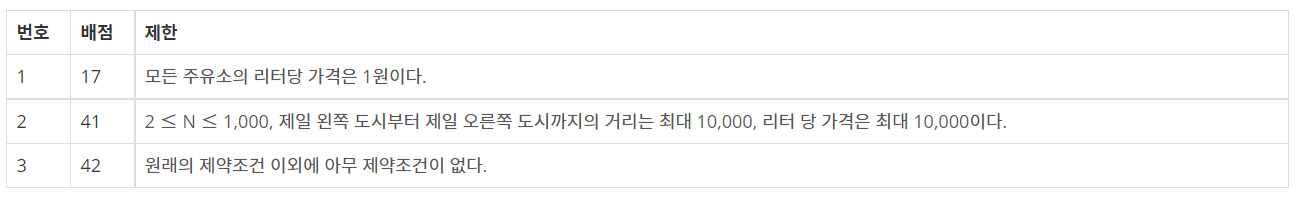 처음 출발할 때 자동차에는 기름이 없어서 주유소에서 기름을 넣고 출발하여야 한다. 기름통의 크기는 무제한이어서 얼마든지 많은 기름을 넣을 수 있다. 도로를 이용하여 이동할 때 1km마다 1리터의 기름을 사용한다. 각 도시에는 단 하나의 주유소가 있으며, 도시 마다 주유소의 리터당 가격은 다를 수 있다. 가격의 단위는 원을 사용한다.