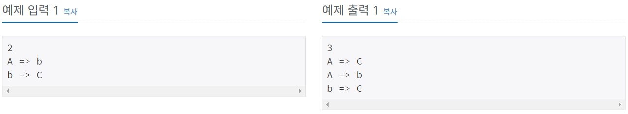 첫째 줄에 정수 N(1 ≤ N ≤ 10,000)이 주어진다. 다음 N개의 줄에는 참인 명제들이 주어진다. 명제는 "P => Q"의 꼴로 주어지는데, “=>”는 앞뒤가 공백으로 구분되어 있다. P나 Q는 명제를 나타내는 문자인데, 알파벳 대소문자 한 글자를 사용한다. 같은 명제가 여러 번 주어질 수도 있다.