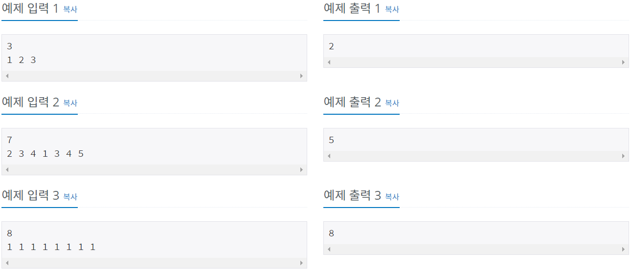 이는, 주어진 수열의 길이가 3이상인 경우 결과값의 최솟값은 2임을 의미하기도 한다.