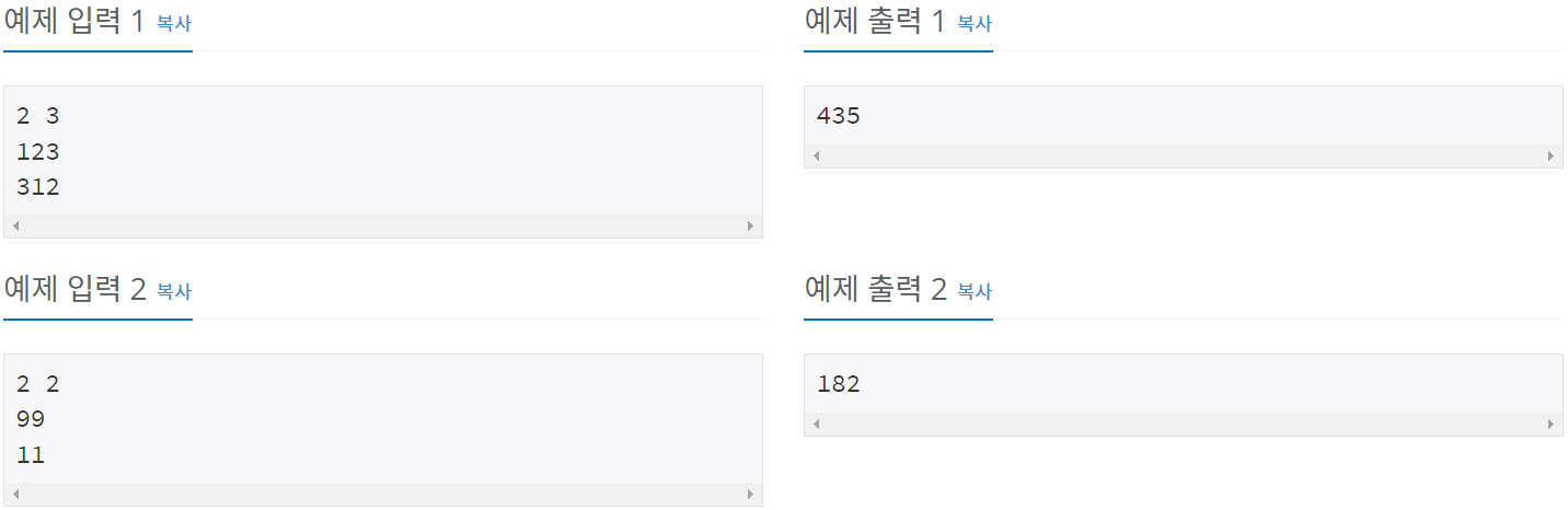 영선이는 직사각형을 겹치지 않는 조각으로 자르려고 한다. 각 조각은 크기가 세로나 가로 크기가 1인 직사각형 모양이다. 길이가 N인 조각은 N자리 수로 나타낼 수 있다. 가로 조각은 왼쪽부터 오른쪽까지 수를 이어 붙인 것이고, 세로 조각은 위에서부터 아래까지 수를 이어붙인 것이다.