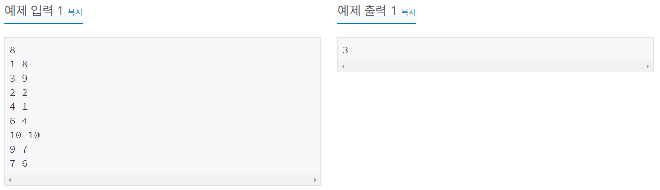 첫째 줄에는 두 전봇대 사이의 전깃줄의 개수가 주어진다. 전깃줄의 개수는 100 이하의 자연수이다. 둘째 줄부터 한 줄에 하나씩 전깃줄이 A전봇대와 연결되는 위치의 번호와 B전봇대와 연결되는 위치의 번호가 차례로 주어진다. 위치의 번호는 500 이하의 자연수이고, 같은 위치에 두 개 이상의 전깃줄이 연결될 수 없다.