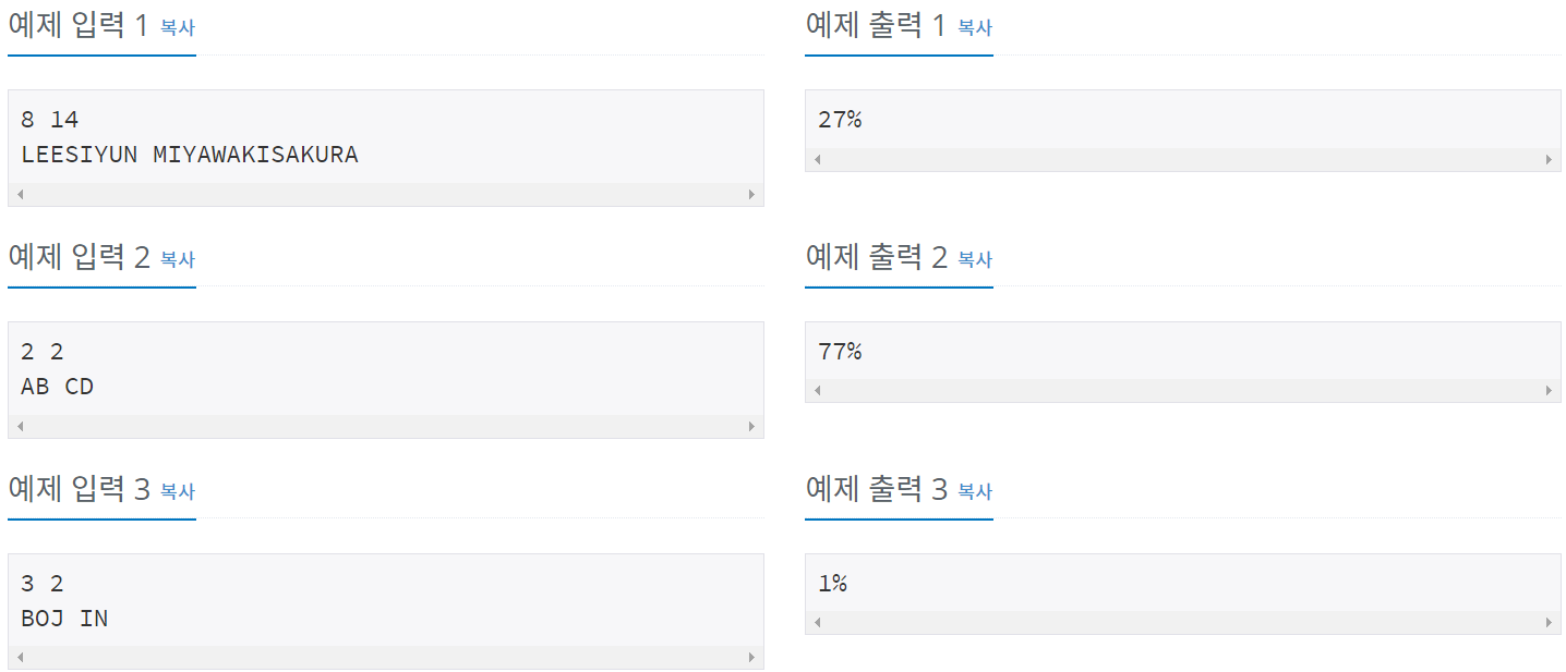 첫 번째 줄에 이름의 길이 N과 M을 받는다. (2 ≤ N, M ≤ 100)