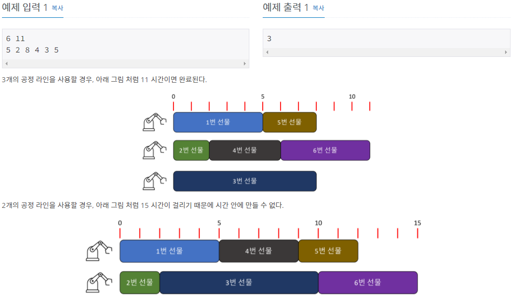 우리는 시간 내에 모든 선물을 제작할 수 있는 공정의 수를 구해야 하고, 이 공정의 수를 최솟값으로 구해야 한다.