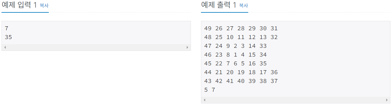 첫째 줄에 홀수인 자연수 N(3 ≤ N ≤ 999)이 주어진다. 둘째 줄에는 위치를 찾고자 하는 N2 이하의 자연수가 하나 주어진다.