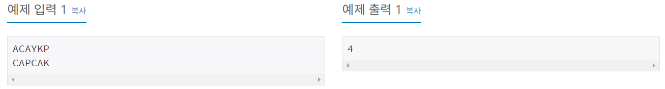 첫째 줄에 입력으로 주어진 두 문자열의 LCS의 길이를 출력한다.