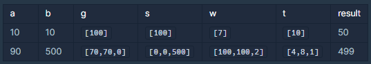fun solution(a: Int, b: Int, g: IntArray, s: IntArray, w: IntArray, t: IntArray): Long {