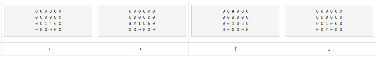 지도에서 0은 빈 칸, 6은 벽, 1~5는 CCTV의 번호이다. 위의 예시에서 1번의 방향에 따라 감시할 수 있는 영역을 '#'로 나타내면 아래와 같다.