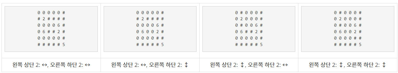 둘째 줄부터 N개의 줄에는 사무실 각 칸의 정보가 주어진다. 0은 빈 칸, 6은 벽, 1~5는 CCTV를 나타내고, 문제에서 설명한 CCTV의 종류이다.