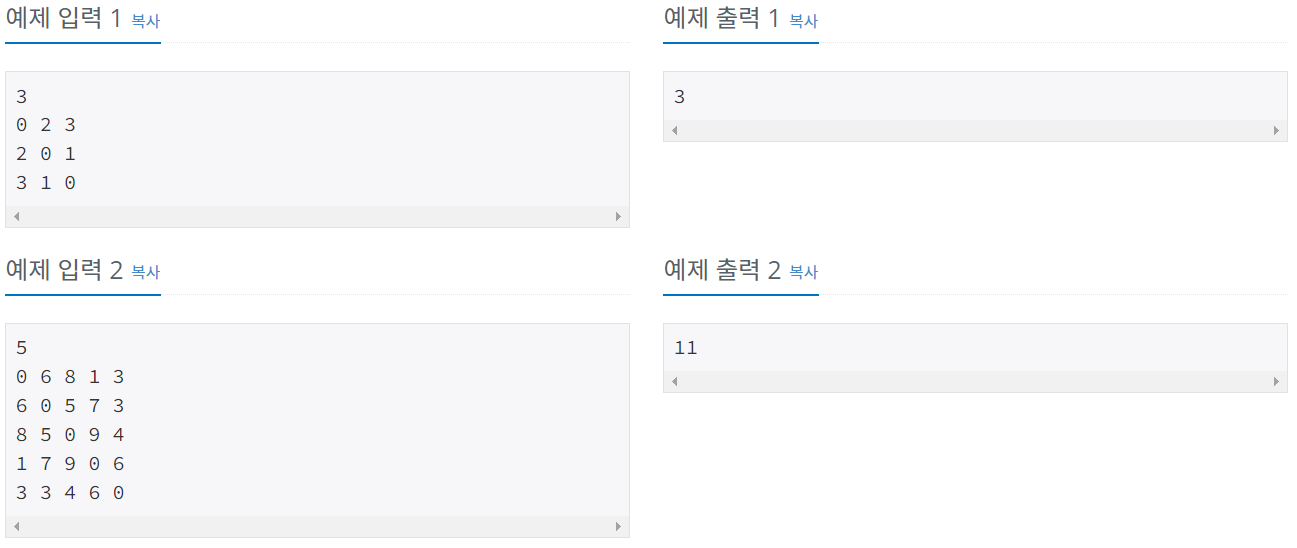 두 번째 줄부터 N+1줄까지 각 행성간의 플로우 관리 비용이 N x N 행렬 (Cij), (1 ≤ i, j ≤ N, 1 ≤ Cij ≤ 100,000,000, Cij = Cji) 로 주어진다.