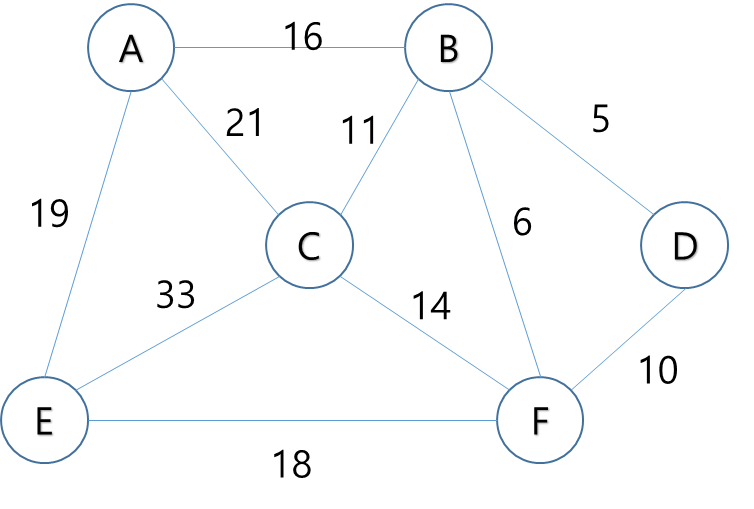 위의 그래프에서 가장 가중치가 적은 간선은 B-D 간선이다.