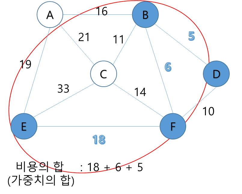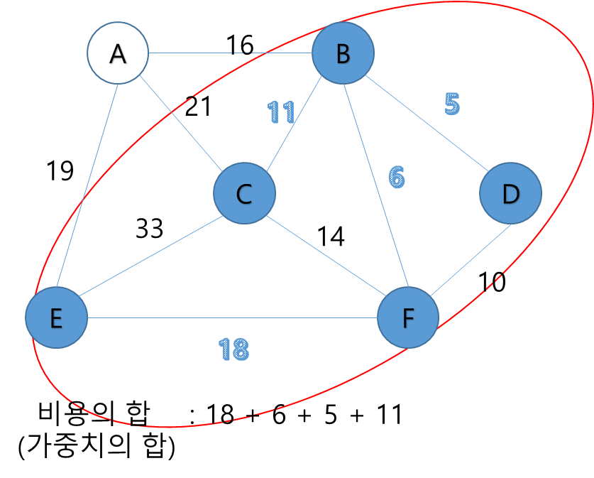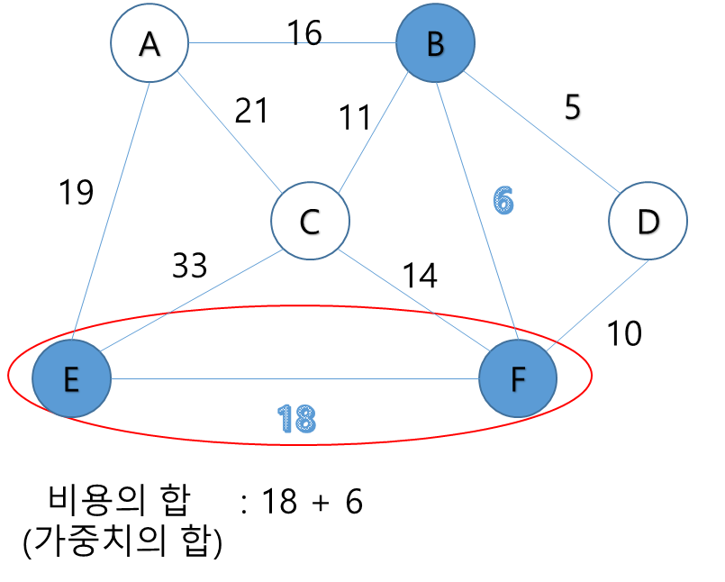 E와 F로 연결된 집합(빨간색 원)에서 갈 수 있는 정점 중 가중치가 가장 작은 간선으로 연결된 정점인 B를 연결한다.