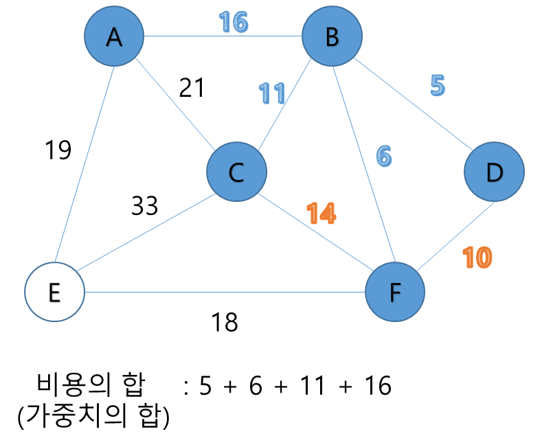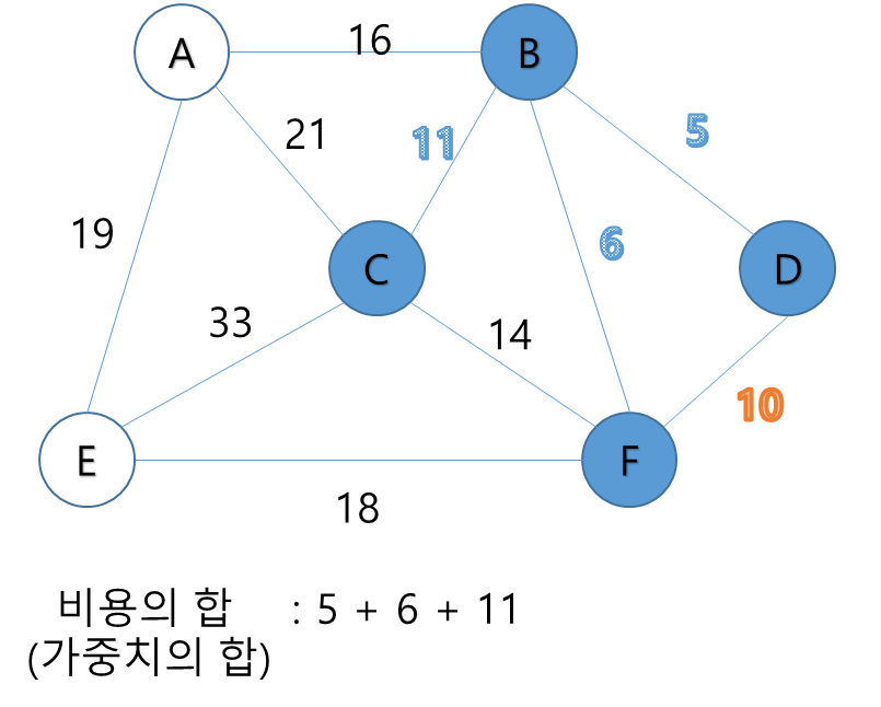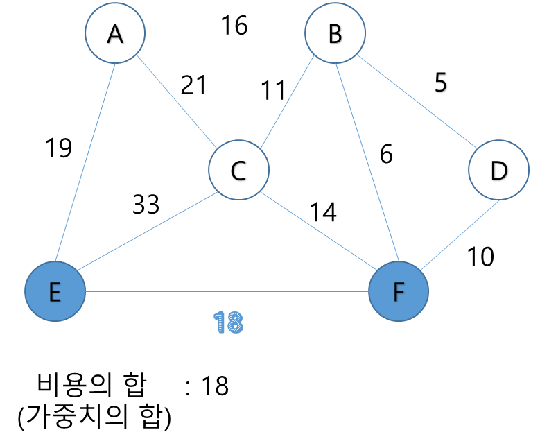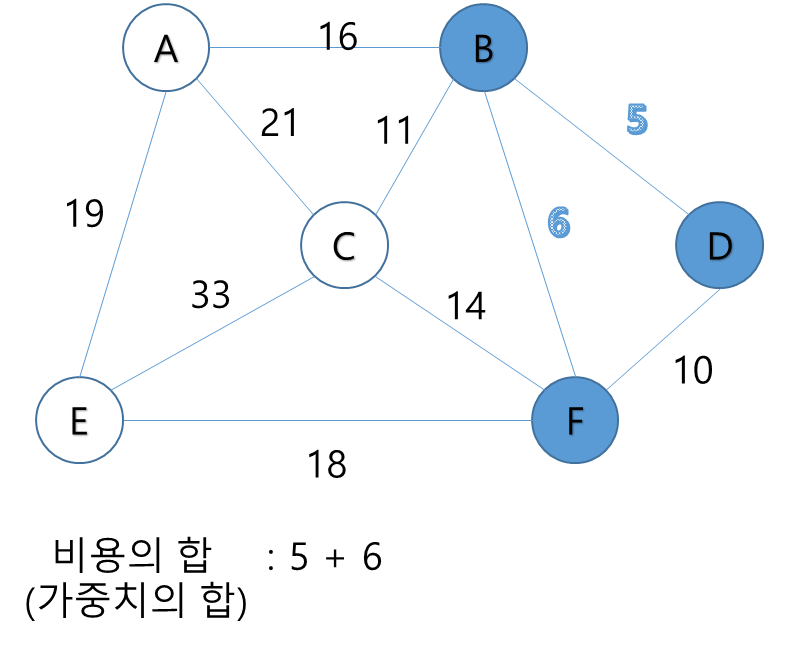 마찬가지로, 그다음 가중치가 가장 적은 간선은 C-F 간선이지만, C와F 정점도 이미 연결되어 있기 때문에 스킵하고,