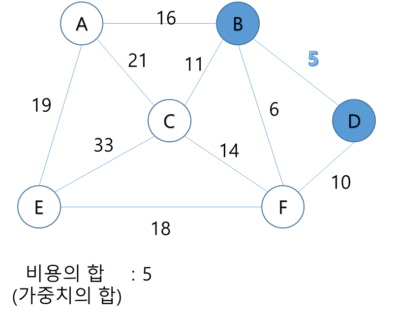 주어진 그래프의 간선 중 가장 가중치가 적은 간선 B-D를 연결한다.