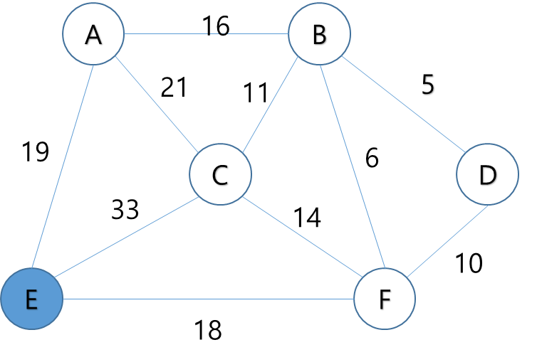 시작점 E에서 갈 수 있는 정점 중(인접한 정점) 가중치가 가장 작은 간선으로 연결된 정점인 F를 연결한다.