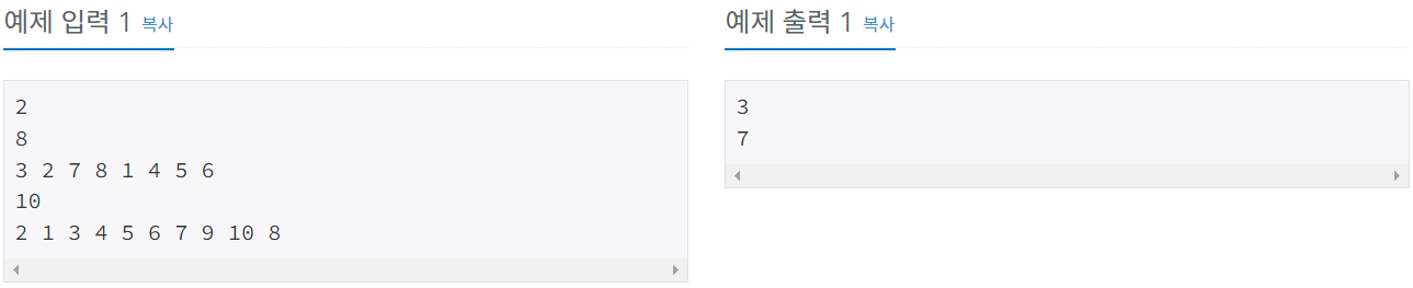 첫째 줄에 테스트 케이스의 개수 T가 주어진다. 각 테스트 케이스의 첫째 줄에는 순열의 크기 N (2 ≤ N ≤ 1,000)이 주어진다. 둘째 줄에는 순열이 주어지며, 각 정수는 공백으로 구분되어 있다.
