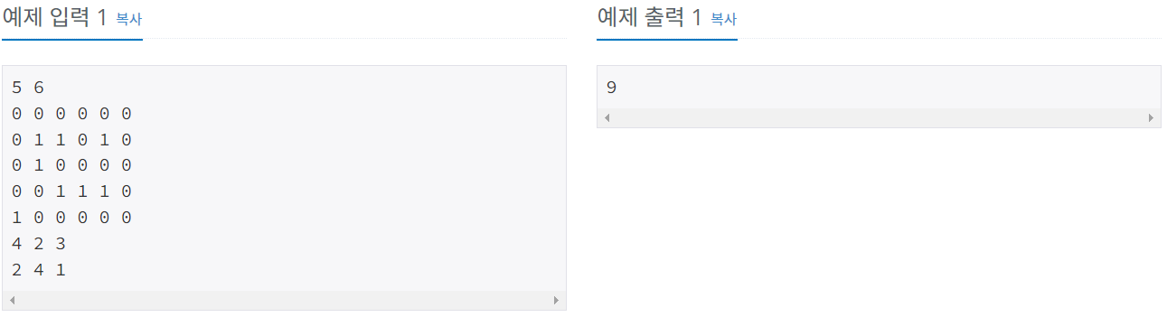 첫째 줄에 공장 내 궤도 설치 상태를 나타내는 직사각형의 세로 길이 M과 가로 길이 N이 빈칸을 사이에 두고 주어진다. 이때 M과 N은 둘 다 100이하의 자연수이다. 이어 M줄에 걸쳐 한 줄에 N개씩 각 지점의 궤도 설치 상태를 나타내는 숫자 0 또는 1이 빈칸을 사이에 두고 주어진다. 다음 줄에는 로봇의 출발 지점의 위치 (행과 열의 번호)와 바라보는 방향이 빈칸을 사이에 두고 주어진다. 마지막 줄에는 로봇의 도착 지점의 위치 (행과 열의 번호)와 바라보는 방향이 빈칸을 사이에 두고 주어진다. 방향은 동쪽이 1, 서쪽이 2, 남쪽이 3, 북쪽이 4로 주어진다. 출발지점에서 도착지점까지는 항상 이동이 가능하다.