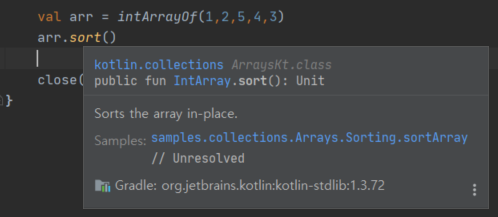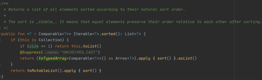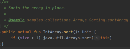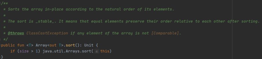 코틀린에서 sort함수를 따라가 보면 내부적으로 java.util.Arrays.sort를 호출하는 것을 알 수 있다.