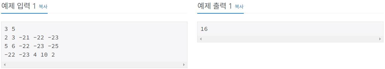 동주가 개발한 게임은 이렇다. 일단 N*M 행렬을 그린 다음, 각 칸에 -10,000 이상 10,000 이하의 정수를 하나씩 쓴다. 그런 다음 그 행렬의 부분행렬을 그려 그 안에 적힌 정수의 합을 구하는 게임이다.