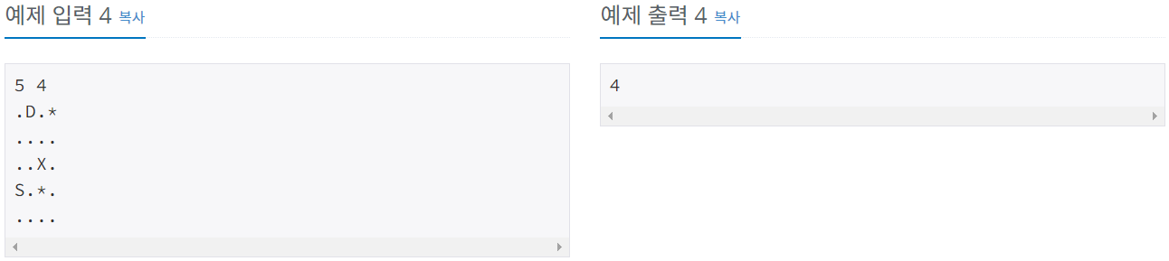 티떱숲의 지도가 주어졌을 때, 고슴도치가 안전하게 비버의 굴로 이동하기 위해 필요한 최소 시간을 구하는 프로그램을 작성하시오.