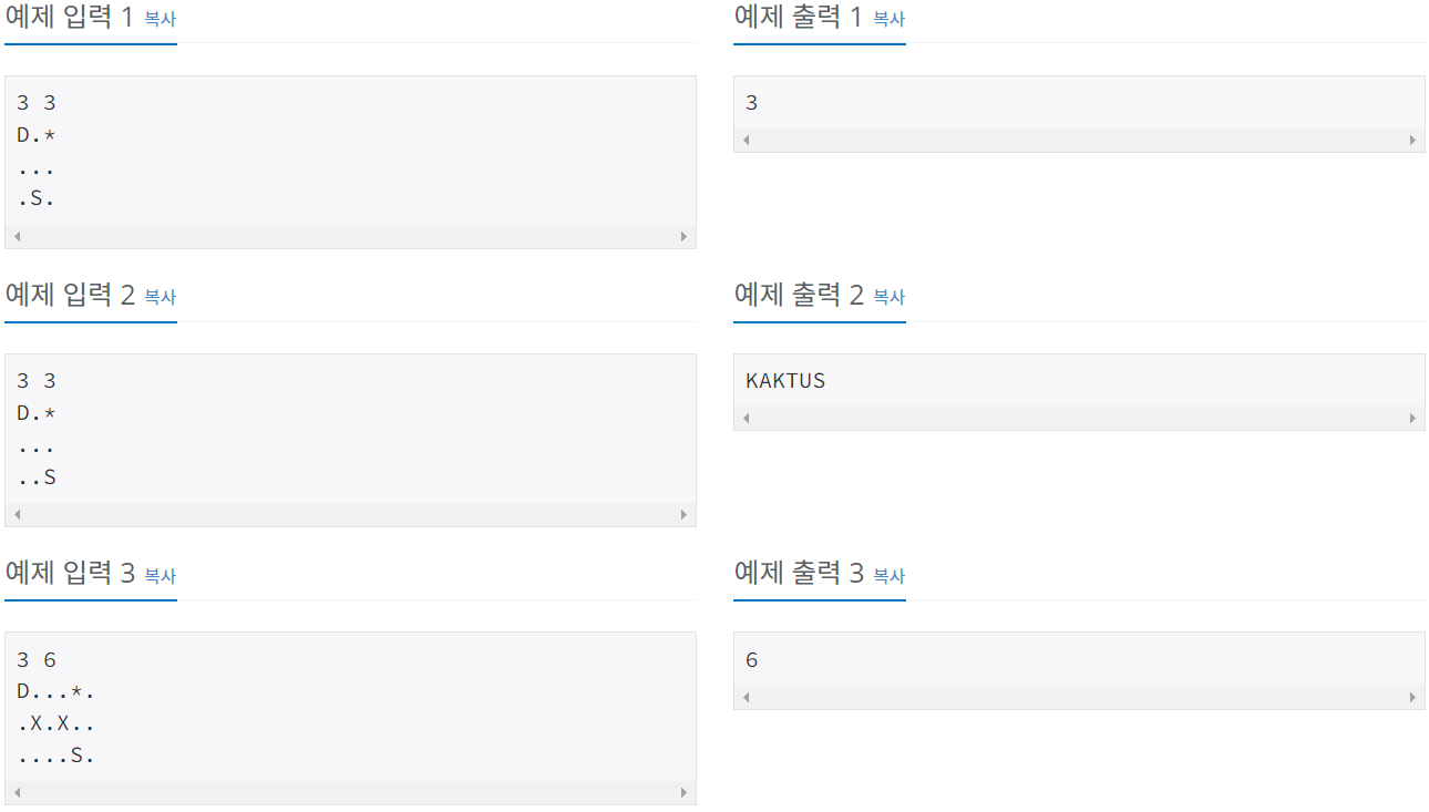 첫째 줄에 고슴도치가 비버의 굴로 이동할 수 있는 가장 빠른 시간을 출력한다. 만약, 안전하게 비버의 굴로 이동할 수 없다면, "KAKTUS"를 출력한다.