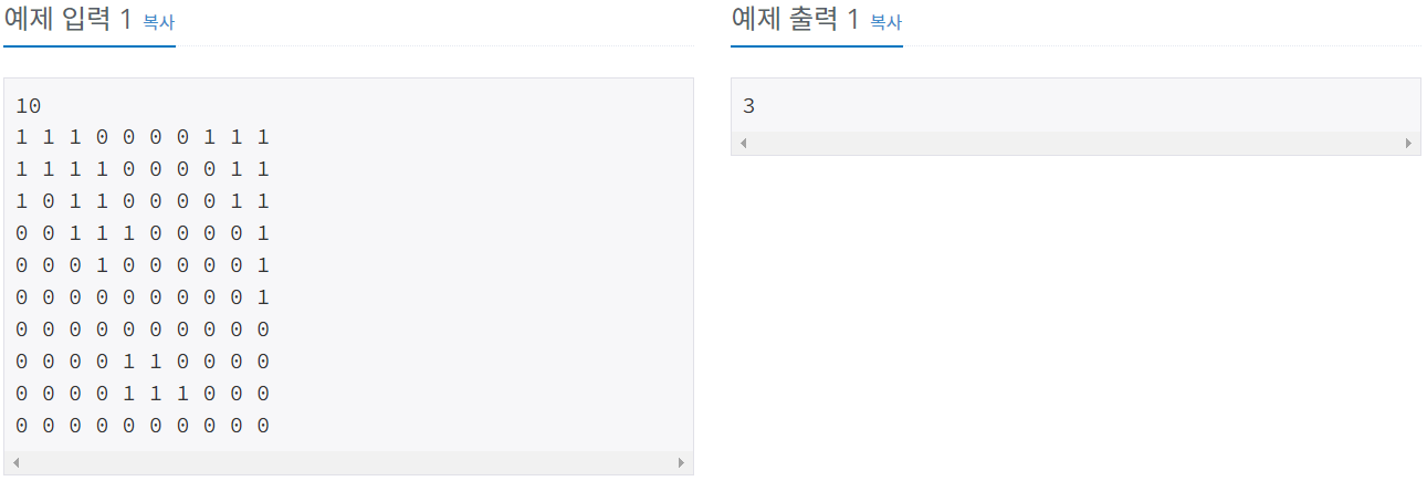 이 나라는 N×N크기의 이차원 평면상에 존재한다. 이 나라는 여러 섬으로 이루어져 있으며, 섬이란 동서남북으로 육지가 붙어있는 덩어리를 말한다. 다음은 세 개의 섬으로 이루어진 나라의 지도이다.