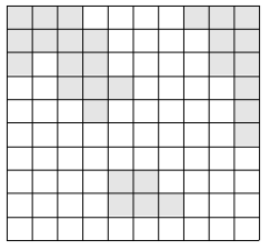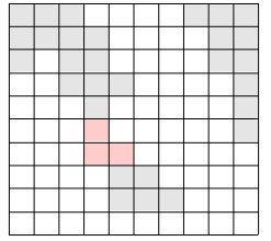 위의 그림에서 색이 있는 부분이 육지이고, 색이 없는 부분이 바다이다. 이 바다에 가장 짧은 다리를 놓아 두 대륙을 연결하고자 한다. 가장 짧은 다리란, 다리가 격자에서 차지하는 칸의 수가 가장 작은 다리를 말한다. 다음 그림에서 두 대륙을 연결하는 다리를 볼 수 있다.