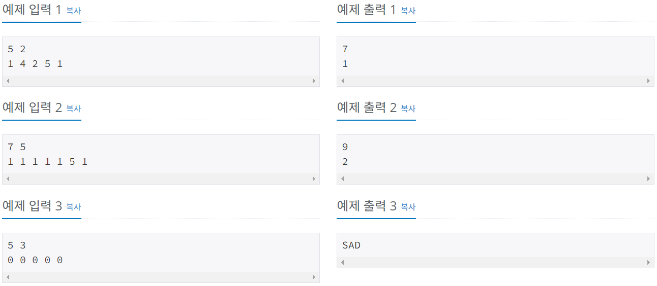 첫째 줄에 $X$일 동안 가장 많이 들어온 방문자 수를 출력한다. 만약 최대 방문자 수가 0명이라면 SAD를 출력한다. 만약 최대 방문자 수가 0명이 아닌 경우 둘째 줄에 기간이 몇 개 있는지 출력한다