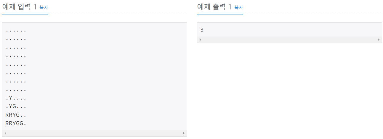 입력으로 주어지는 필드는 뿌요들이 전부 아래로 떨어진 뒤의 상태이다. 즉, 뿌요 아래에 빈 칸이 있는 경우는 없다.