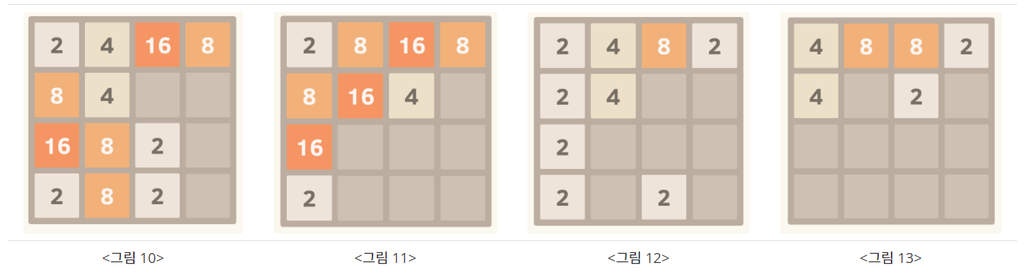 <그림 1>의 경우에서 위로 블록을 이동시키면 <그림 2>의 상태가 된다. 여기서, 왼쪽으로 블록을 이동시키면 <그림 3>의 상태가 된다.